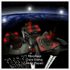 What made these servers unique, was the dedication to Dave Ewing's low gravity map Morpheus, named after the legendary character played by Laurence Fishburne in the amazing science fiction movie The Matrix, which had appeared earlier that year. The official map description: "LMC knew they had found an excellent arena at the very top of a newly constructed Galaxyscraper SuperStructure. Thanks to the modern miracle of super tensile solids, these three buildings reach a staggering 12 miles high at their pinnacle. The thin atmosphere and reduced influence of Earth’s gravity provide an interesting test of the tournament athlete’s ability to adapt and conquer in extreme environment." In combination with the rocket launcher, this map seemed to offer it all, from building-to-building jump-tests to bullet-time rocket-dodging. Learn more about Dave Ewing. Learn more about Morpheus. What is the Matrix?